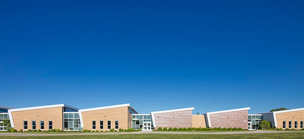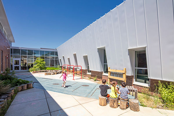 Roofing systems can also seamlessly integrate with wall cladding to create a strong expression. The CCSD59 Early Learning Center design, inspired by the adjacent junior high school’s mansard roof edges, features a bent plate of metal panels on its roof and south-facing walls.
