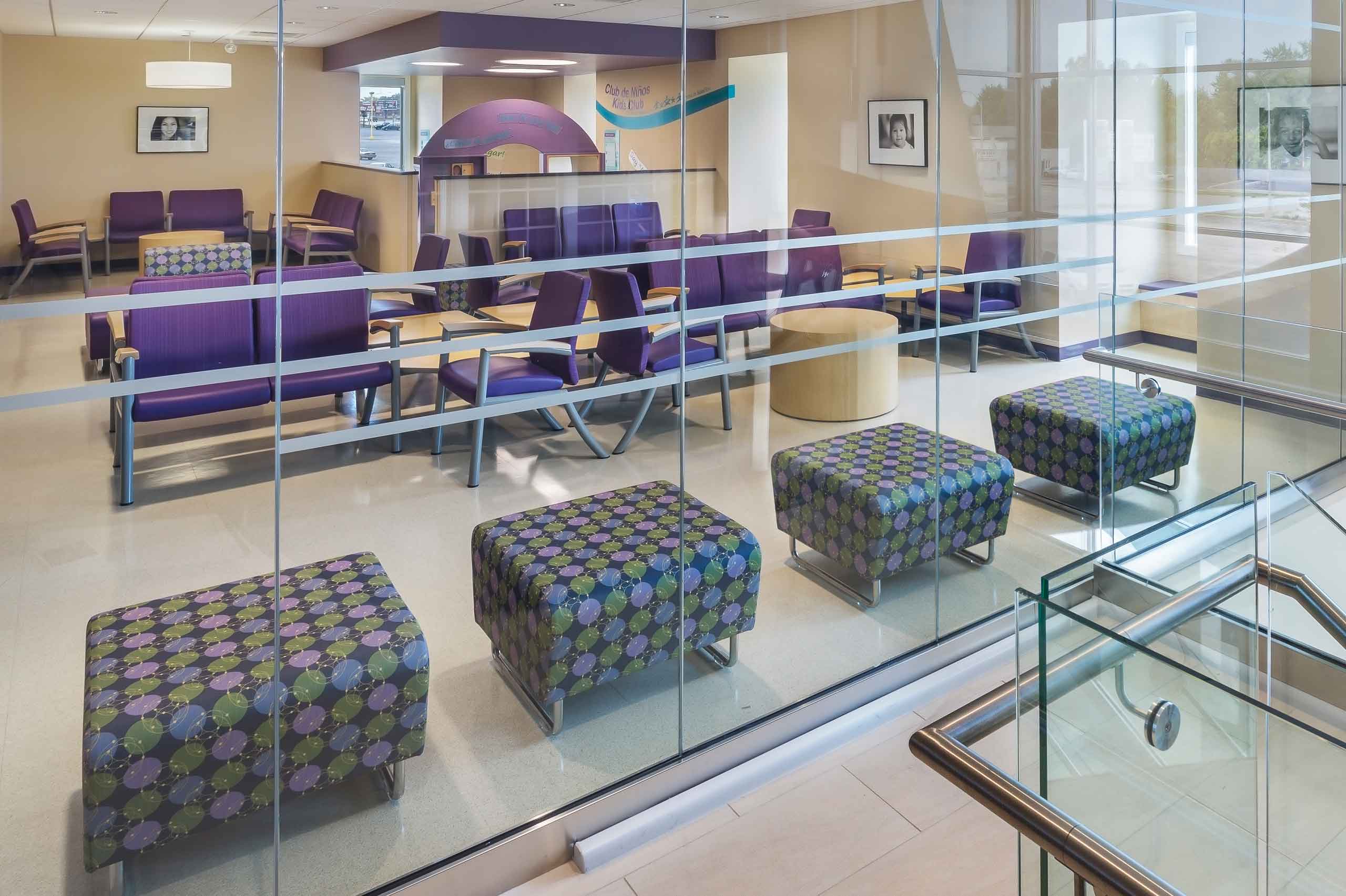 Before construction, the building’s hardwood paneling, marble, and granite made it insular and less welcoming. The renewed interiors, fusing the client’s color scheme with contemporary materials, welcome the community and celebrate the facility’s origins. An extended display window houses a grand stair and brings natural light deep into the building. Photos of the owner’s diverse staff and clientele line the corridors.