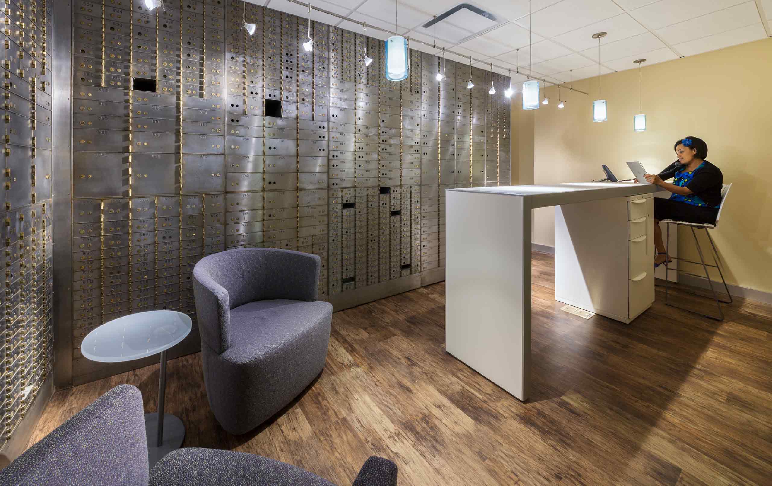 Refurbished vault doors with spinning locks recall the facility’s previous role. On the lower level, former safe deposit boxes create a decorative backdrop in the lounge-like staff break room.