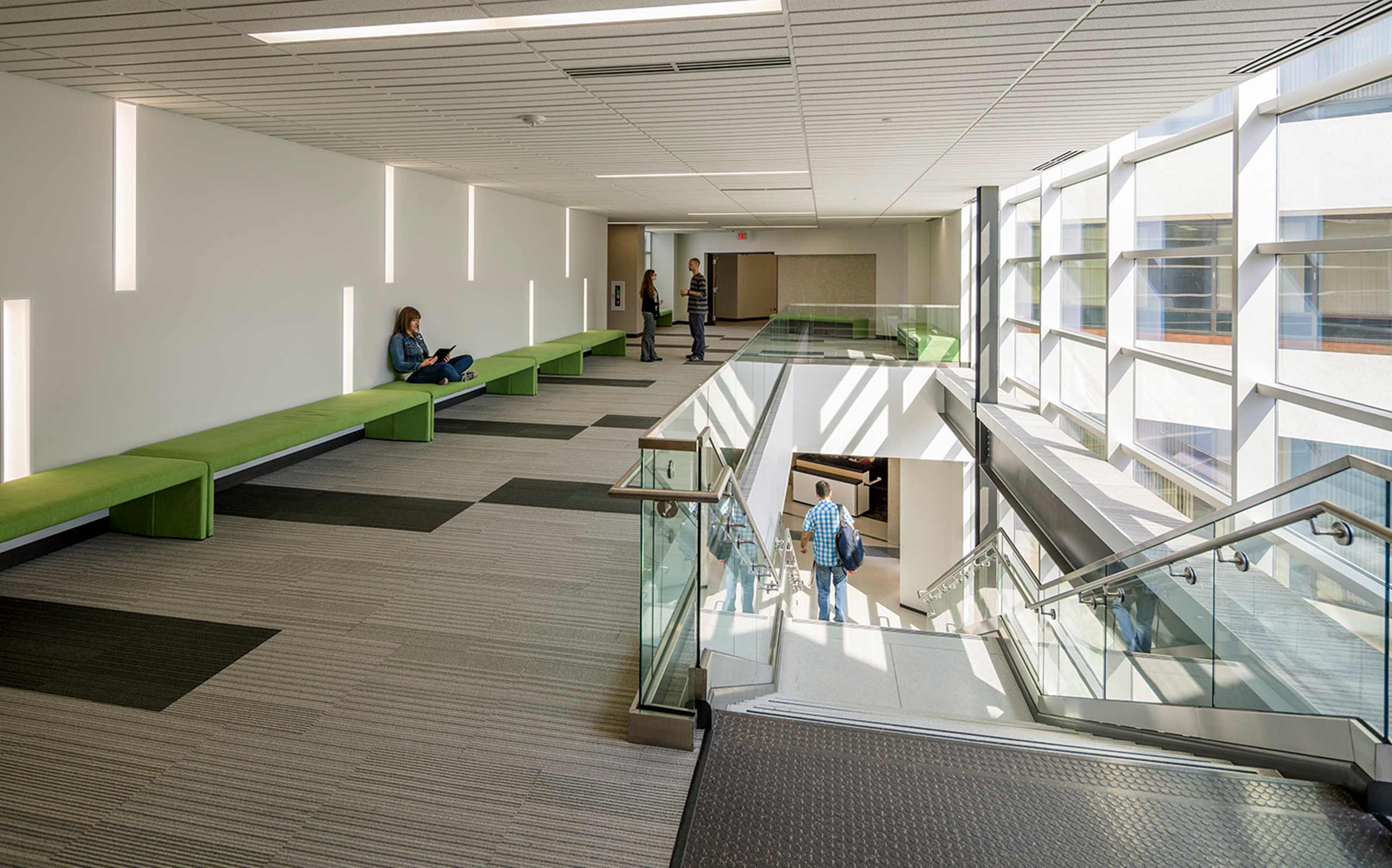The three-level center has offices, lecture halls, learning laboratories, a fitness center, locker rooms, and student common areas. Large-scale learning labs house 100 to 300 students but also support small-scale teams. Each lab offers video screens and large tables with eight stations wired for computers.