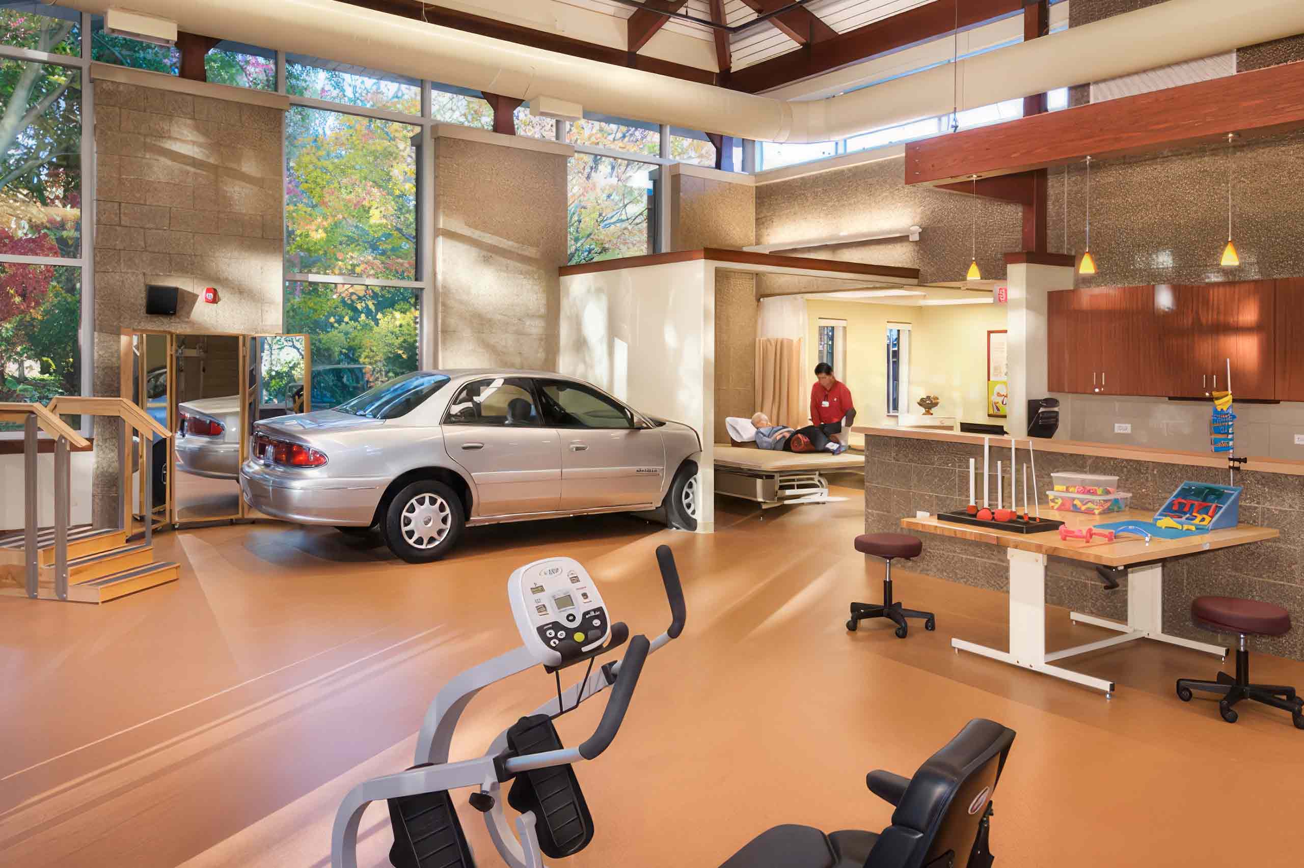 The physical therapy gym addition features heavy timber construction, earthy colors, and durable materials that mesh into the natural surroundings visible through large windows. The positioning of the workstation allows therapists to observe patients.